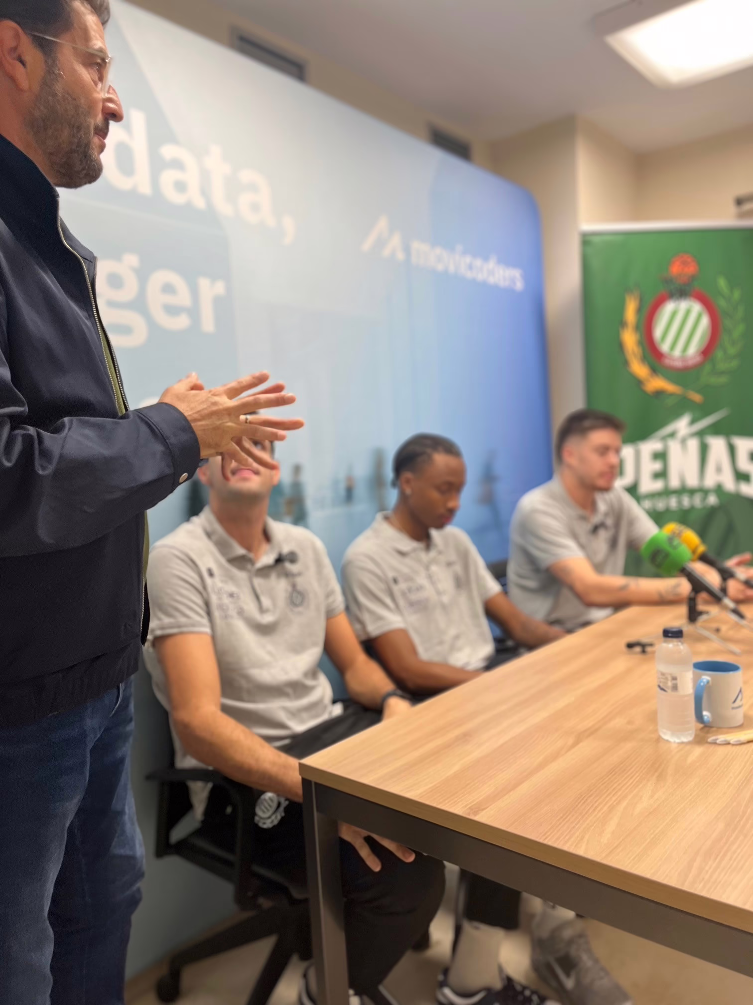 La rueda de prensa comenzó con una charla muy cercana entre nuestro director técnico Carmelo Marín y Fernando Lascorz. Durante la conversación, Fernando nos felicitó por nuestro aniversario y agradeció públicamente a Movicoders el apoyo y la colaboración con el equipo. También compartió lo mucho que le gustó conocer nuestra trayectoria durante el evento de aniversario, y descubrir que llevamos nuestros proyectos desde Huesca a los cinco continentes.